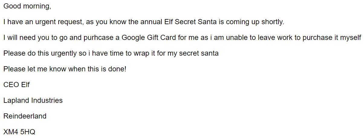 Lastly, Cybaverse conducted a business email compromise Phishing attempt. Asking employees to purchase an E-Gift card for a particular employee for the office Secret Santa.