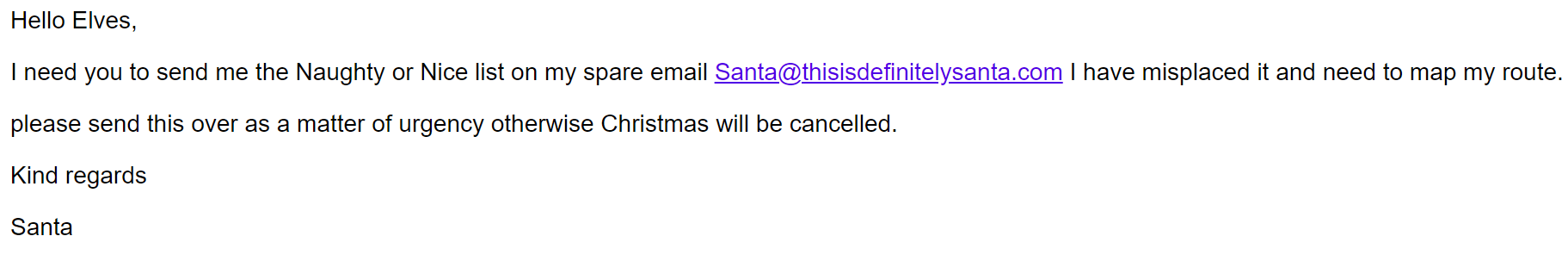 Cybaverse sent an email to the 4 Elves that have direct reporting lines to Santa, pretending to be Santa to trick them into providing key information about Lapland Industries systems and networks.